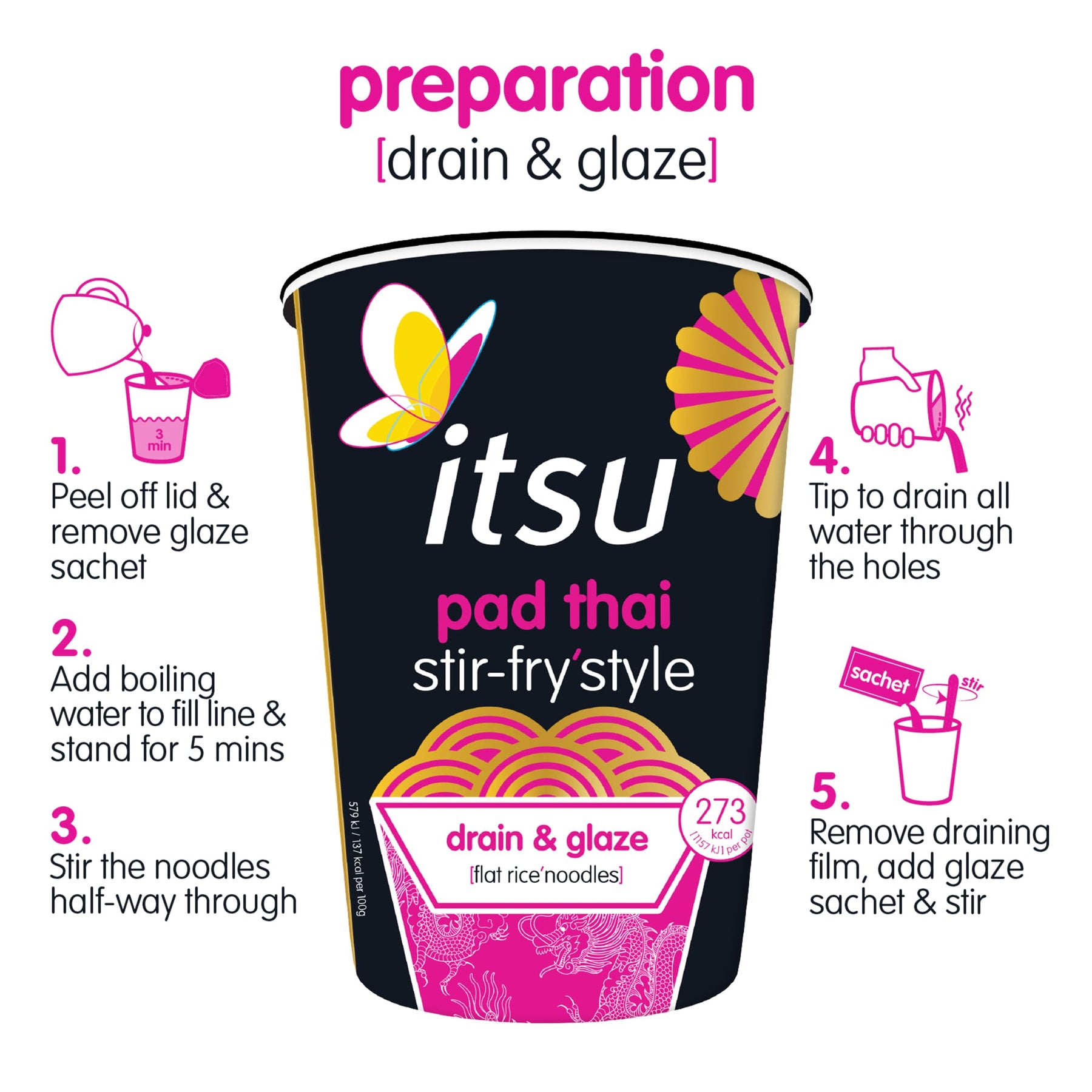 Itsu stir fry style noodles multipack introduces a captivating blend of air dried (not fried) rice noodles and an authentic sweet soy and sesame glaze. Cooked, strained, and folded into Toshio's hand-crafted glaze, they offer a delightful twist to traditional noodle experiences. Peel back the lid to discover the exquisite taste and texture of teriyaki chicken flavoured stir fry style noodles.