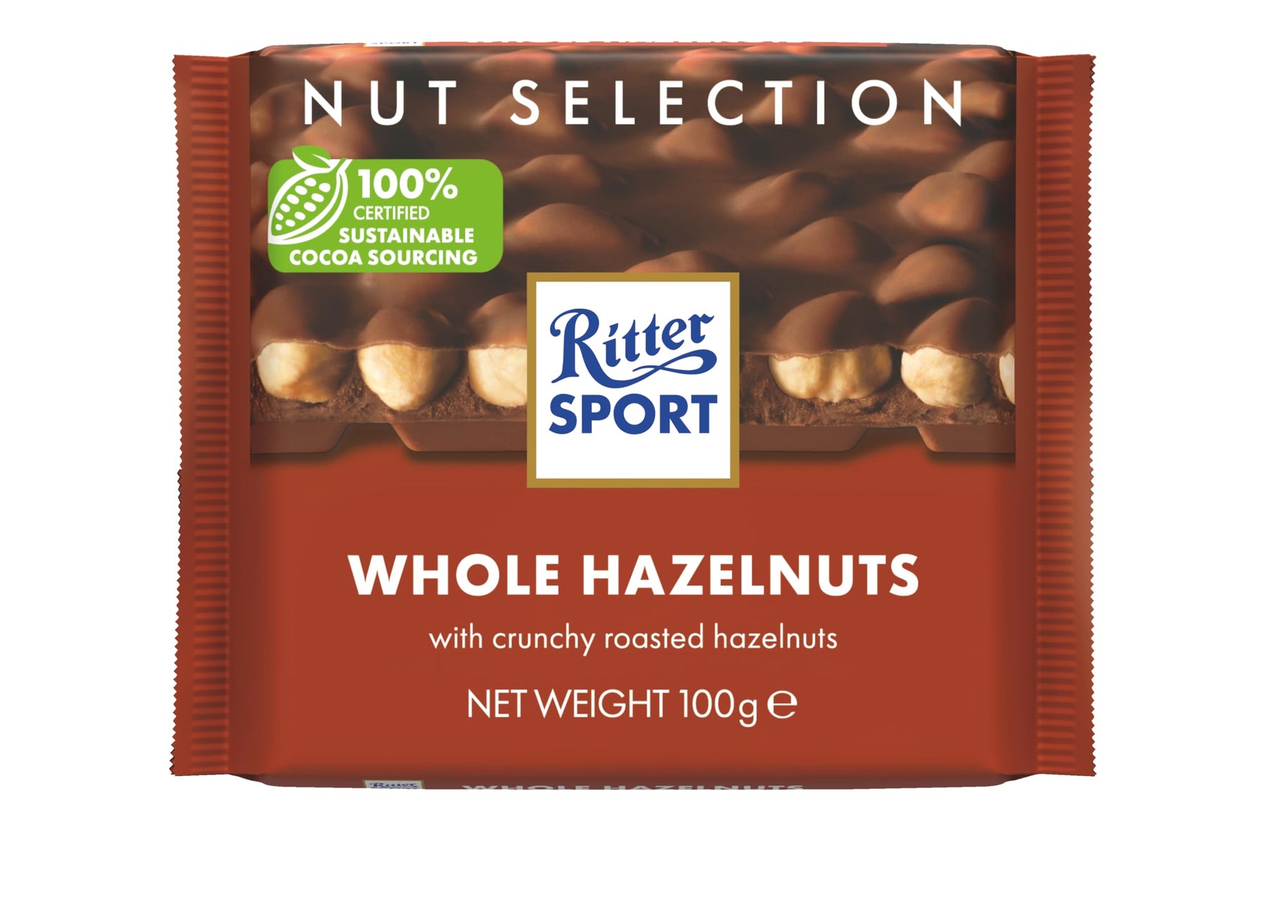- Ingredients include whole hazelnuts, milk chocolate, and sustainably sourced cocoa