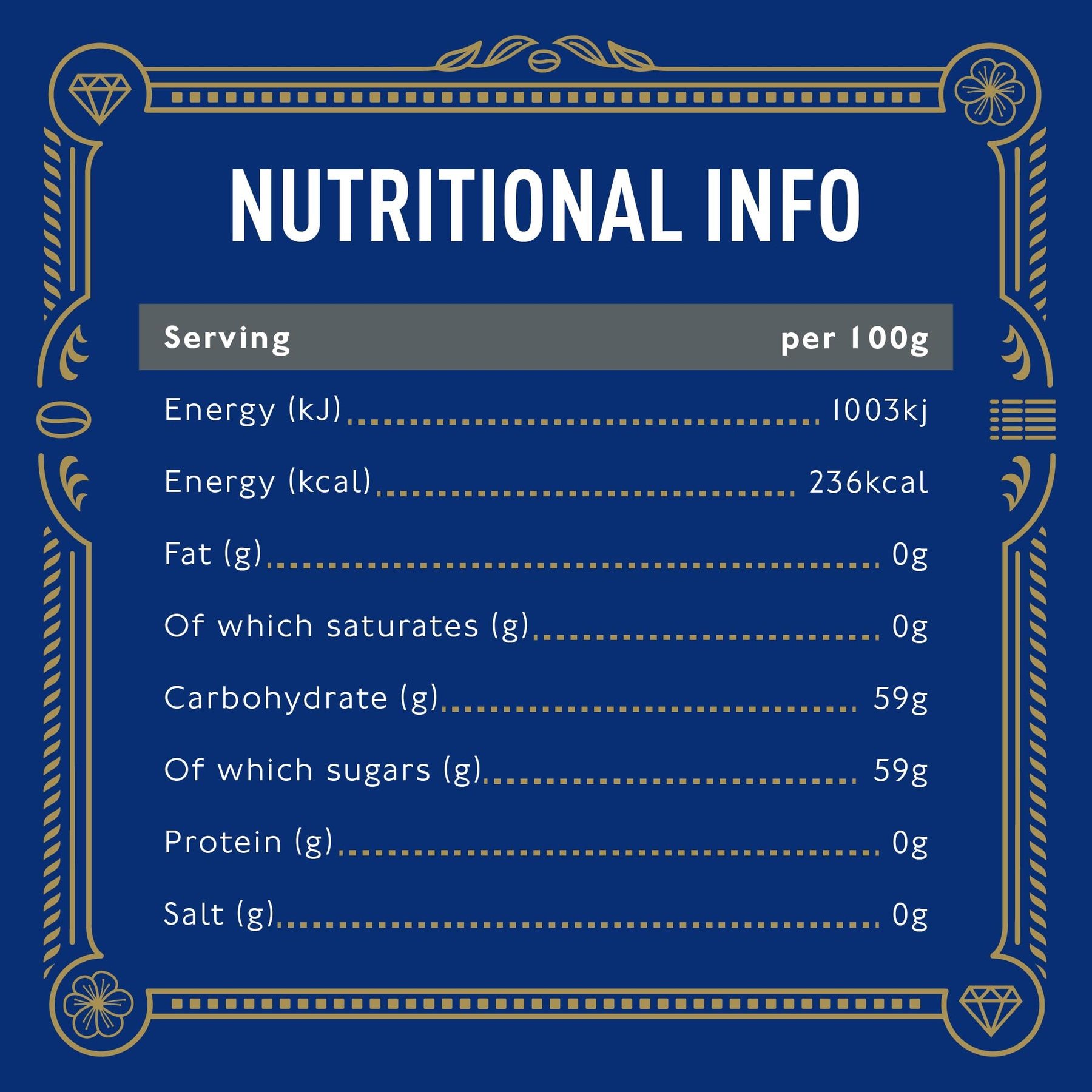 - Nutritional Info (per 100ml): 348kcal, 87g carbohydrates (all sugars), 0g fat, 0g protein