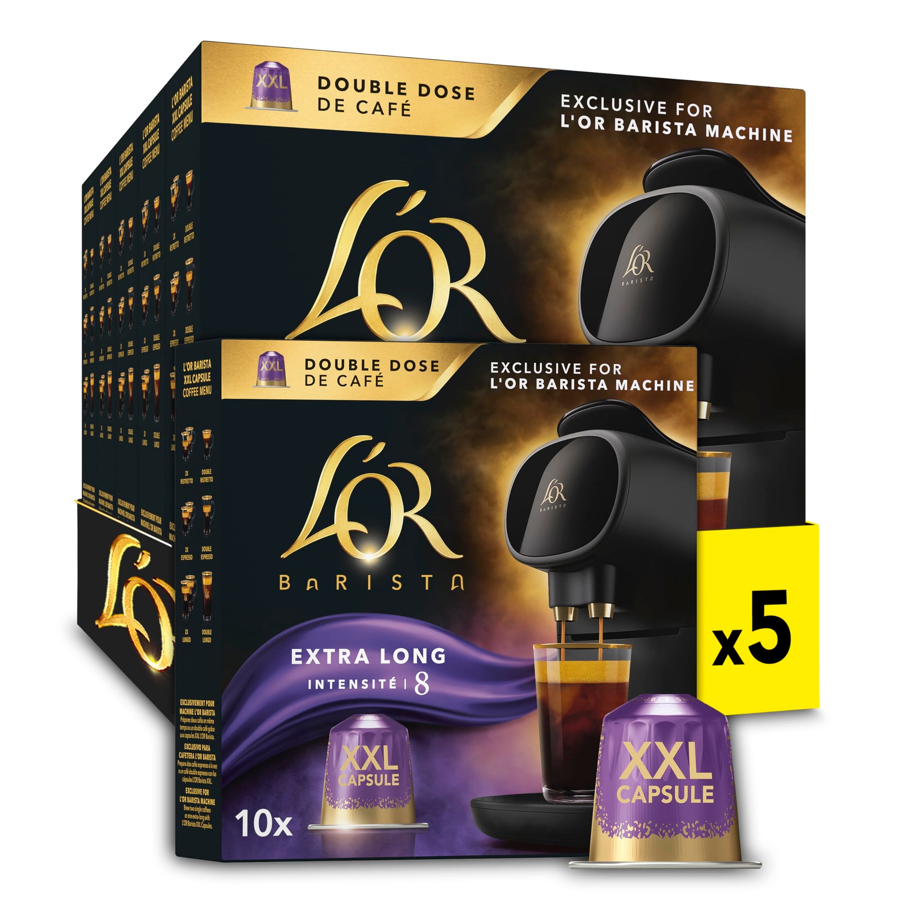 Each pack contains 50 (5 x 10) L'OR BARISTA Double Lungo Profondo XXL capsules with an intensity level of 8, crafted from infinitely recyclable aluminium and made with responsibly sourced coffee for a sustainable coffee experience.