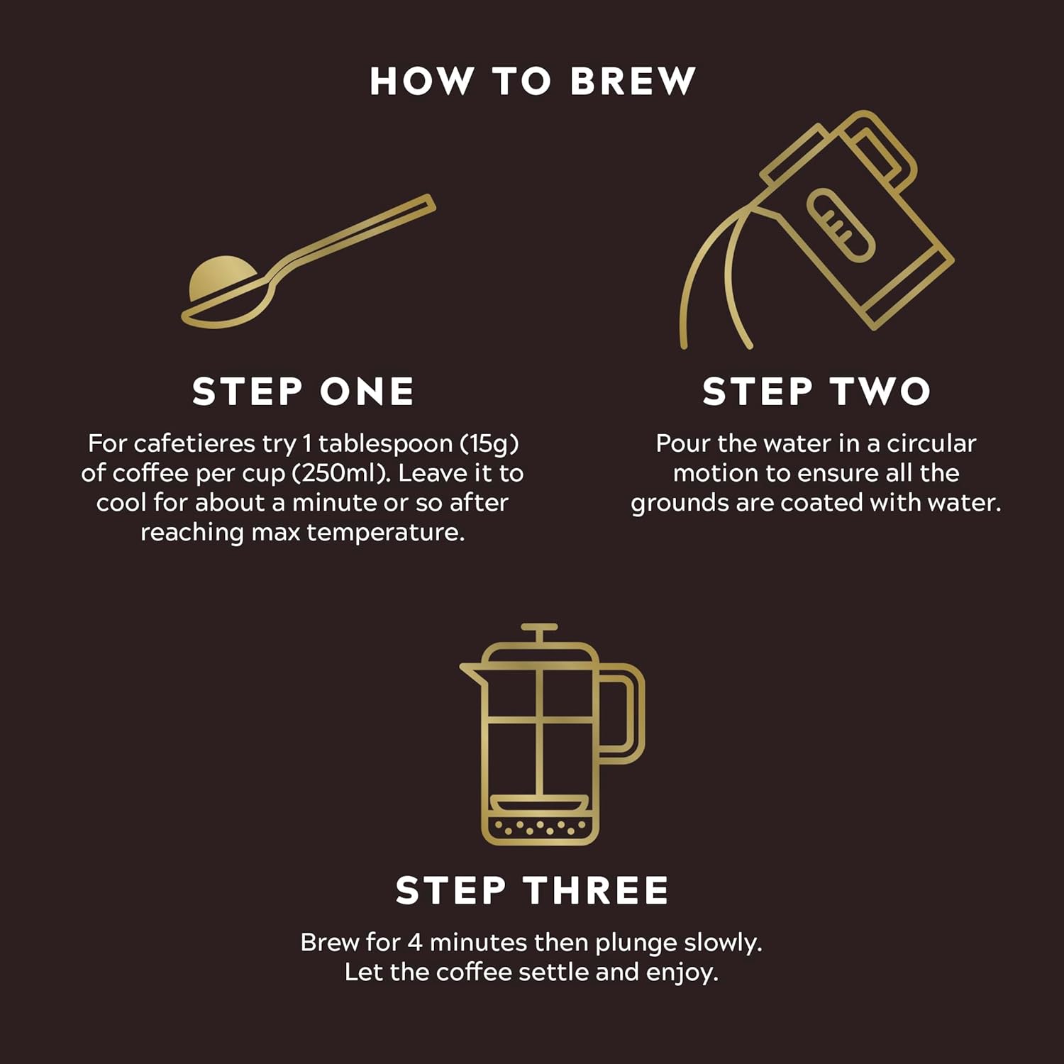 - For cafétieres: Use 1 heaped dessert spoon per cup. Add hot water (just off the boil), stir, leave for 4 minutes, then plunge and enjoy.
