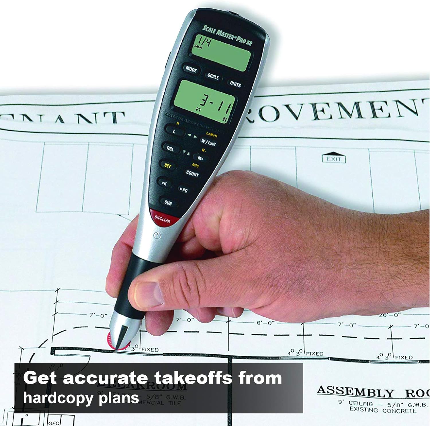 - Advanced Digital Plan Measure: Roll the precision red wheel on any printed plans, drawings, or maps to take off linear distances, square areas, or cubic volumes quickly and accurately.
