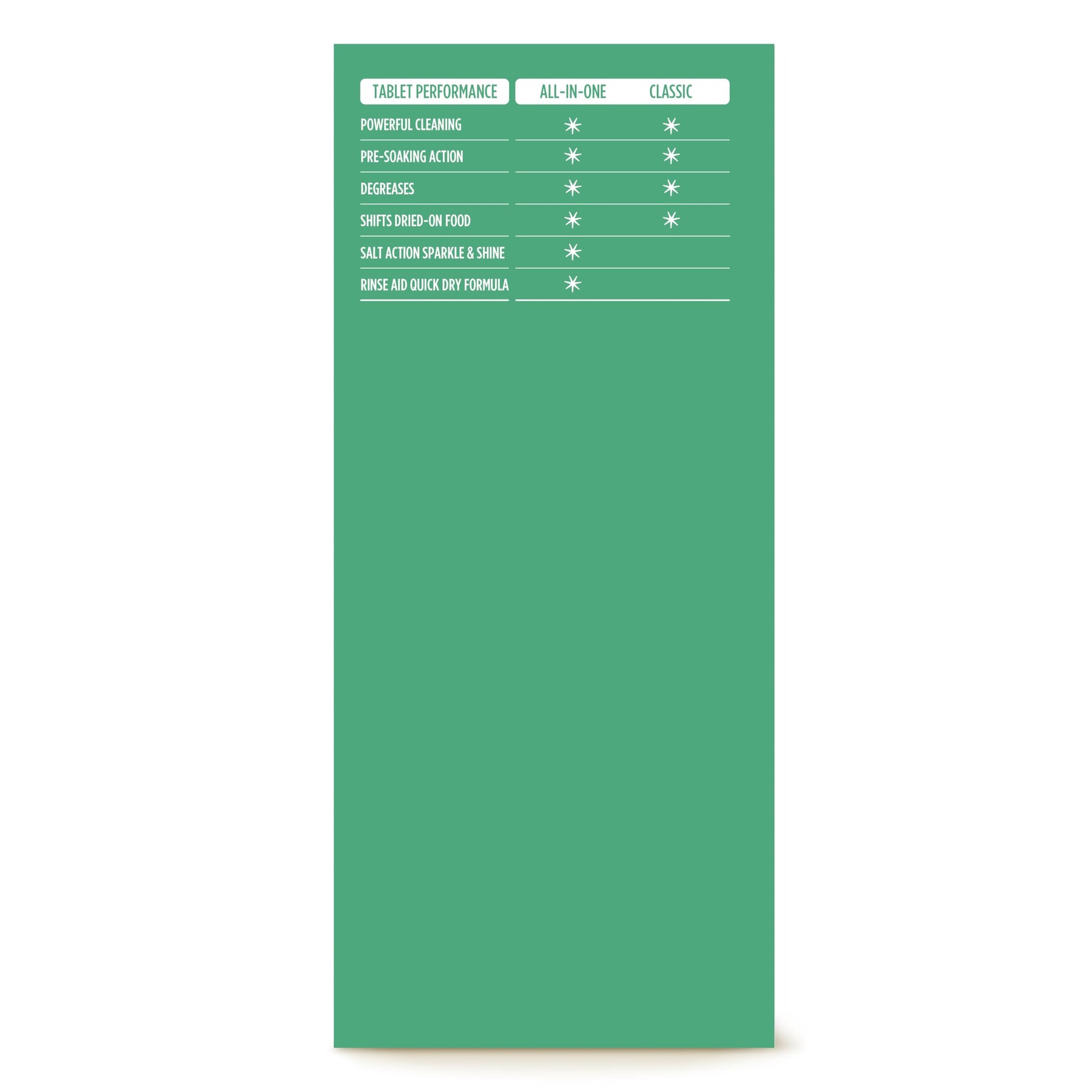 - All-in-One Dishwasher Tablet: Combines powerful cleaning, pre-soaking action, degreasing, salt action, and rinse aid