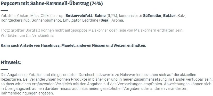 Ingredients: Sugar, popped maize, glucose syrup, butterfat (MILK), cream (MILK) (6.7%), condensed whey (MILK), butter (MILK), salt, partially inverted refiners syrup, sunflower oil, emulsifier: SOYA lecithins, flavourings.