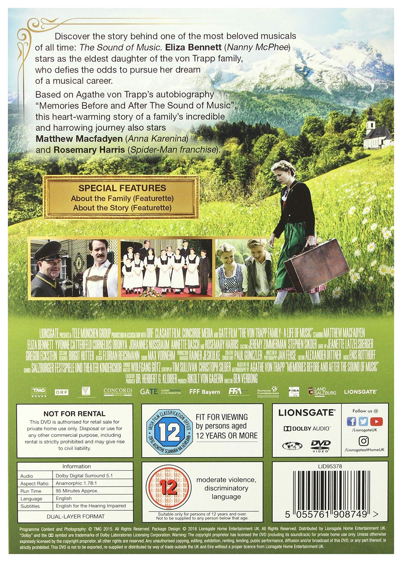 Discover the story behind one of the most beloved musicals of all time: The Sound of Music. Eliza Bennett (Nanny McPhee) stars as the eldest daughter of the von Trapp family, defying the odds to pursue her dream of a musical career, in the true story of their incredible and harrowing journey. Based on Agathe von Trapp’s autobiography "Memories Before and After the Sound of Music", this heart-warming story of a family drawn into desperate circumstances also stars Matthew Macfadyen (Anna Karenina) and Rosemary Harris (Spider-Man franchise).