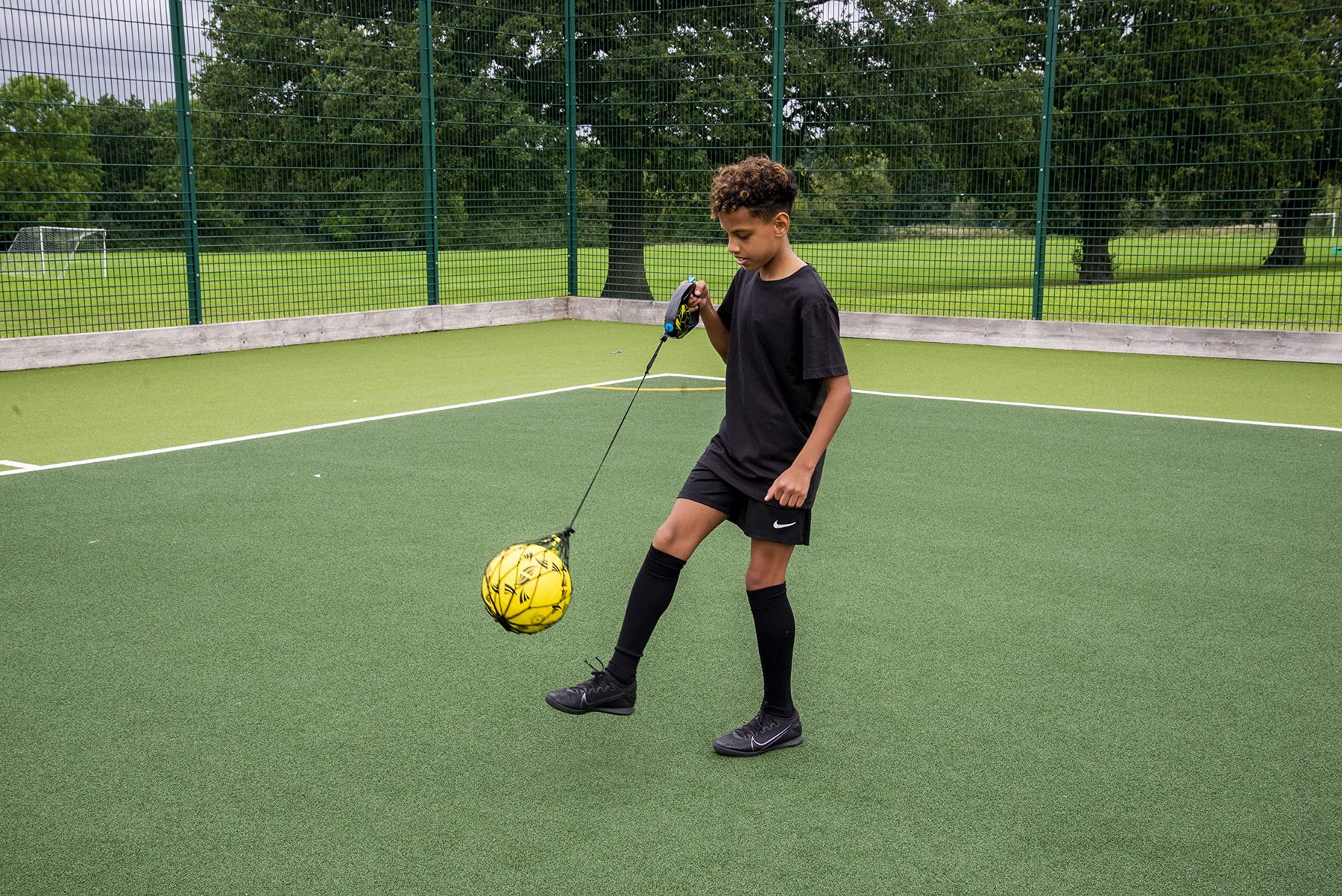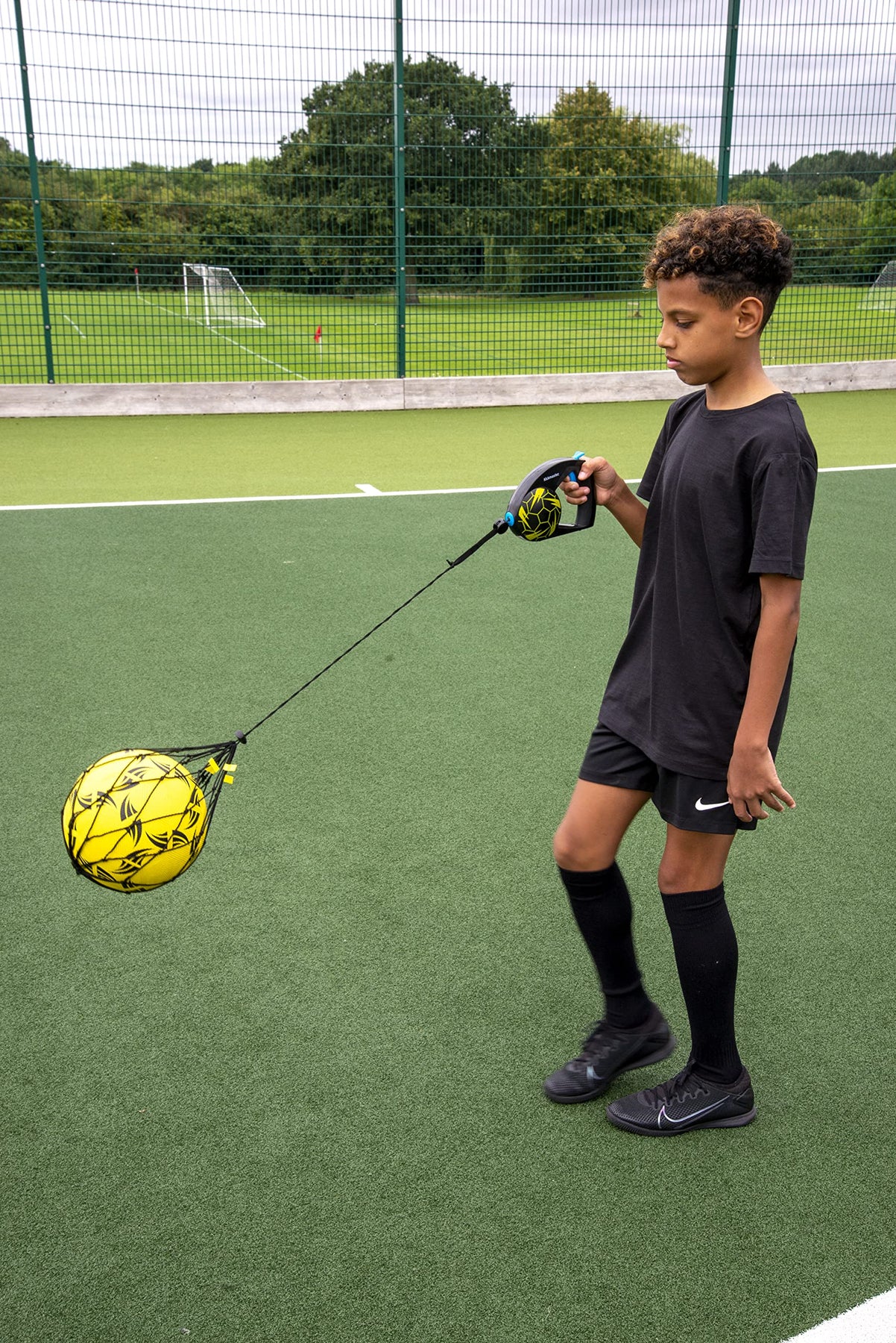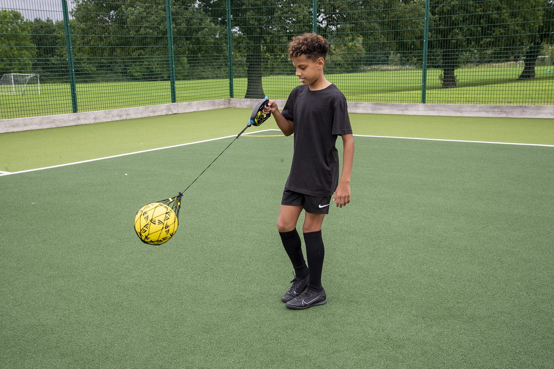 The Kickmaster Close Control Trainer is the original handheld football training aid, designed to enhance ball control, passing, and shooting skills. Its patented recoil mechanism ensures the ball returns with precision, enabling effective practice of keep-ups and first-touch control.