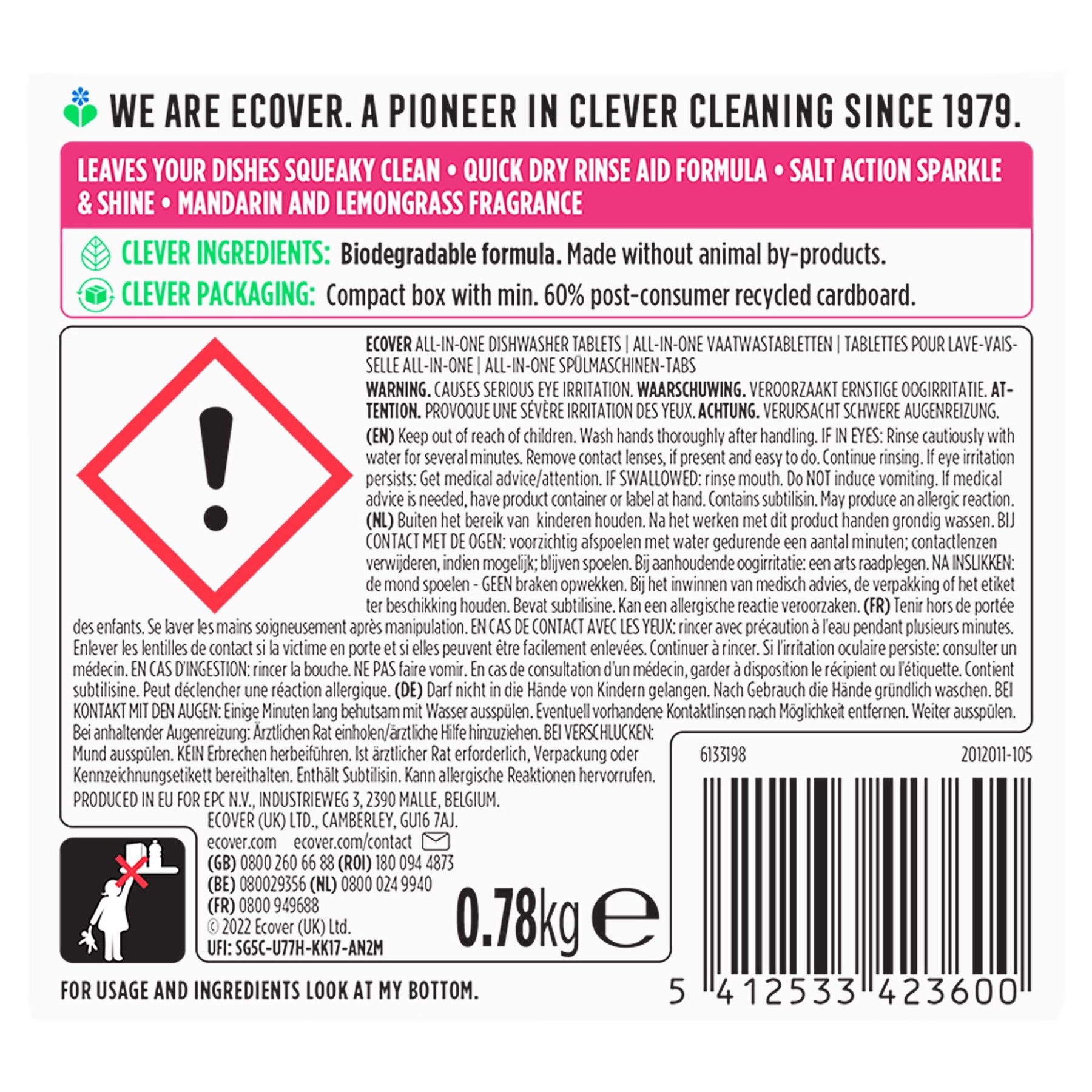 Ecover All-In-One Dishwasher Tablets deliver powerful cleaning performance with an innovative, biodegradable formula. Infused with a refreshing mandarin and lemongrass fragrance, these tablets tackle grease, dried-on food, and tough stains without the need for pre-rinsing or pre-soaking.