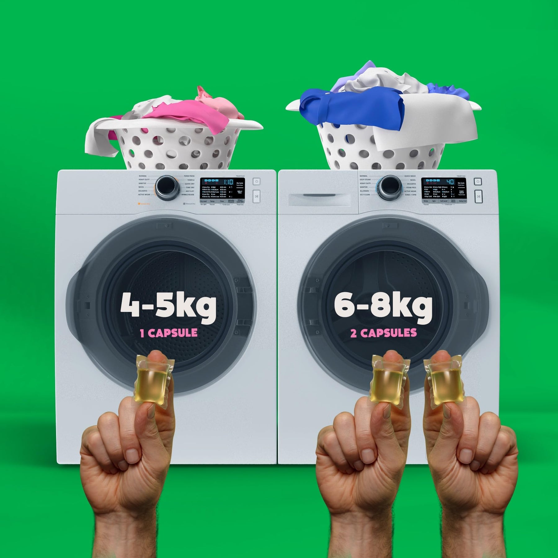 • How to use: Place one capsule at the back of an empty drum, add clothes on top. Use 1 capsule for lightly soiled loads or soft/medium water; 2 capsules for heavily soiled clothes or large machines