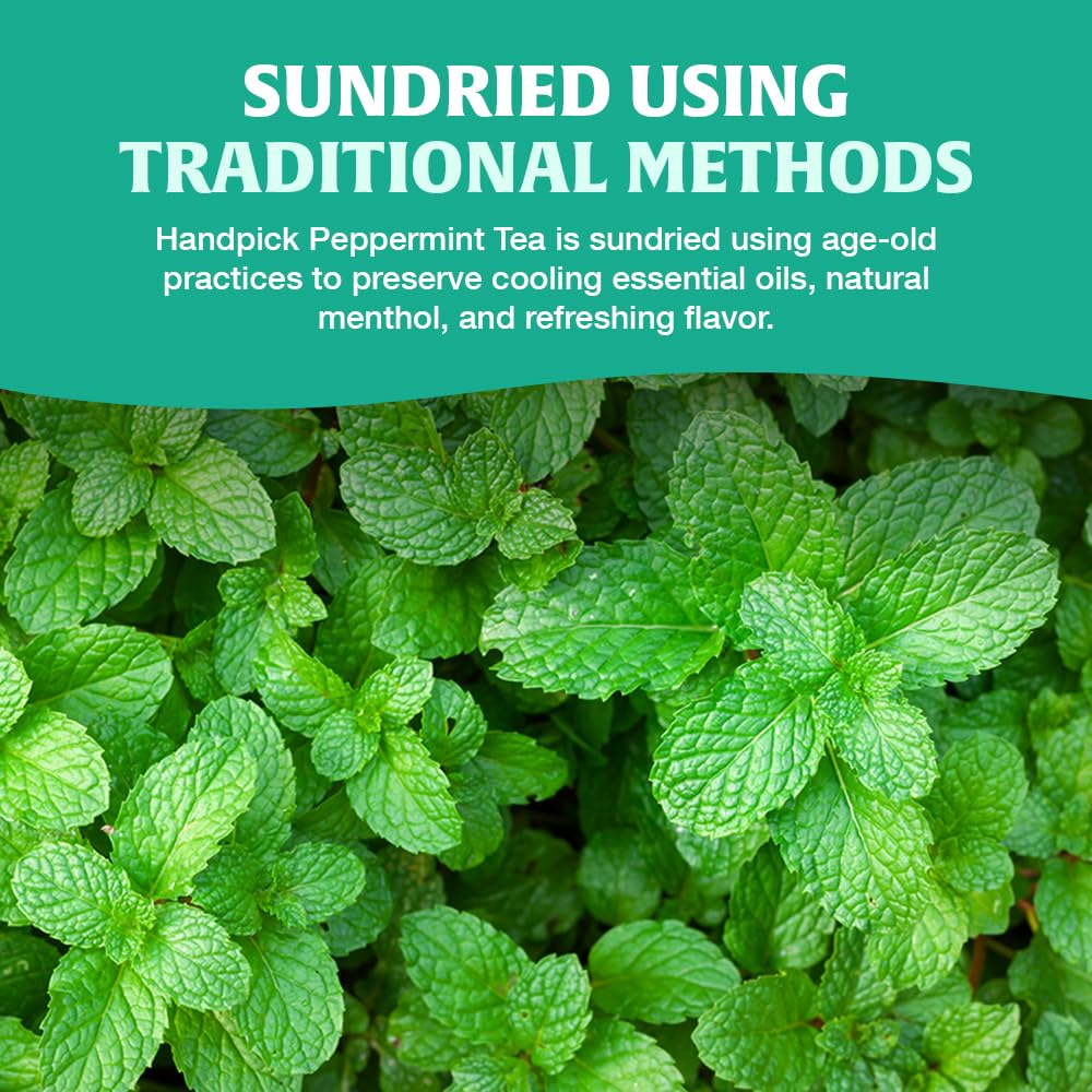 Enjoy the crisp, invigorating flavor of 100% pure peppermint with HANDPICK's premium herbal tea bags. Sourced from naturally grown peppermint leaves, this caffeine-free tisane delivers a refreshingly cool and aromatic experience in every cup. Celebrated for its soothing and cooling properties, this pure herbal infusion contains no artificial flavors, additives, colors, or preservatives.