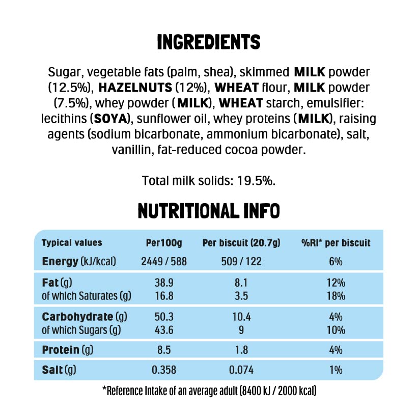 • Ingredients: Sugar, vegetable fats (palm, shea), skimmed milk powder (12.5%), hazelnuts (12%), wheat flour, milk powder (7.5%), whey powder (milk), wheat starch, emulsifier: lecithins (soya), sunflower oil, whey proteins (milk), raising agents (sodium bicarbonate, ammonium bicarbonate), salt, vanillin, fat-reduced cocoa powder
