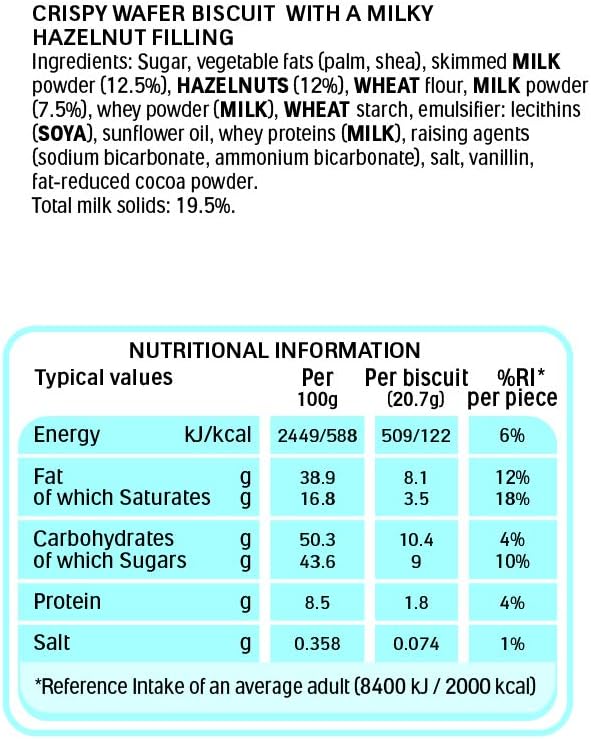 • Crispy wafer biscuit with a double milk and hazelnut cream filling