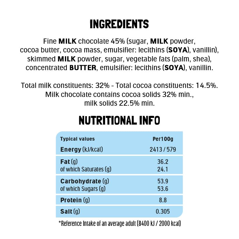 • Contains 45% fine milk chocolate: sugar, milk powder, cocoa butter, cocoa mass, emulsifier (soya), vanillin