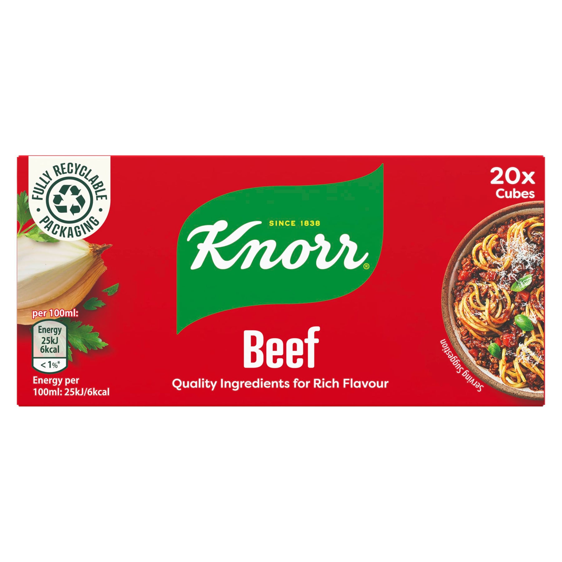 Enhance the flavour of your dishes with the full-bodied taste of Knorr Beef Stock Cubes. Made with real vegetables, herbs, and beef stock powder, these gluten-free cubes deliver a rich and rounded beef flavour that forms the perfect foundation for hearty stews, delicious sauces, soups, and more. Each pack contains 20 x 10g cubes, ideal for long-term use in your kitchen.