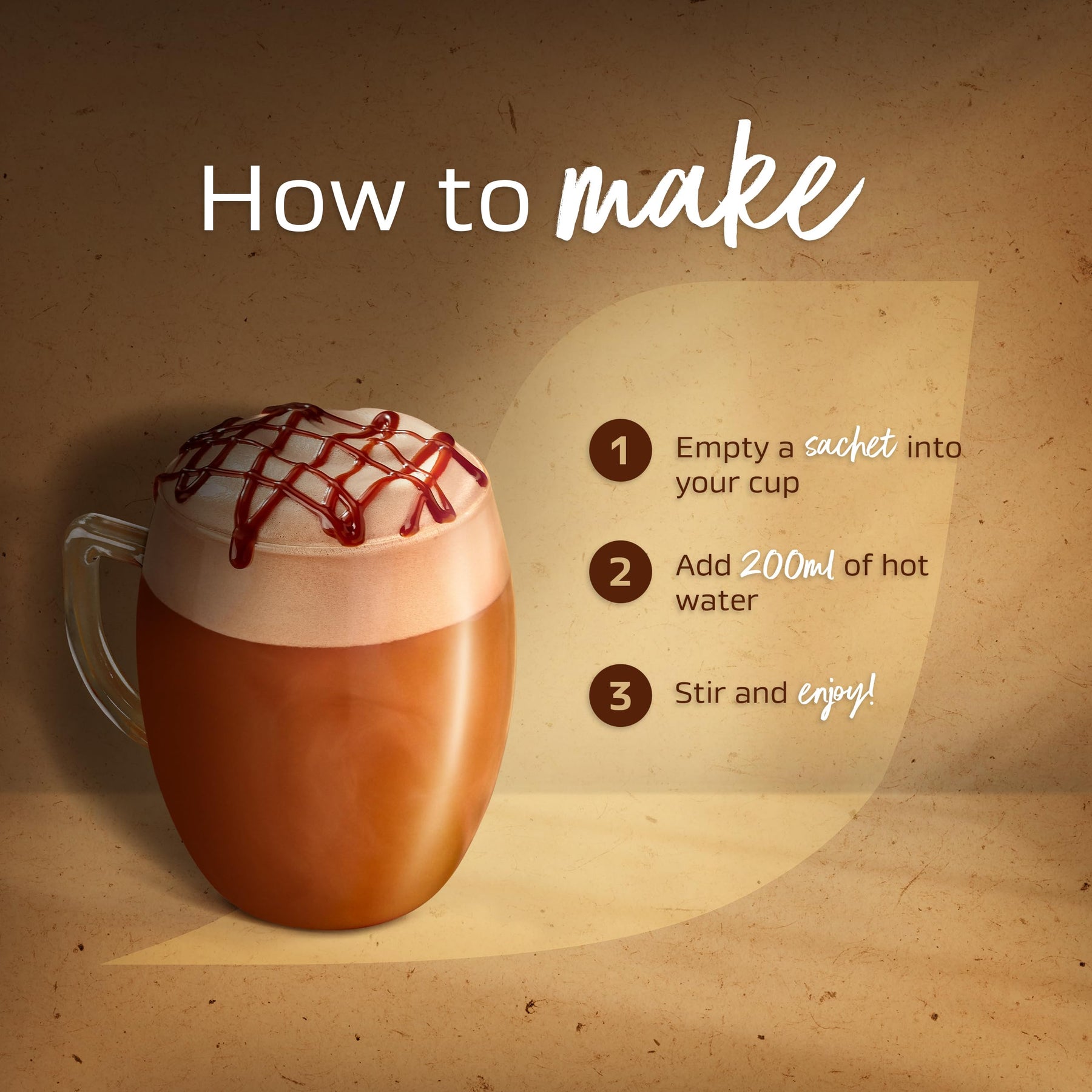 • Preparation: Empty one sachet into a mug, add 200ml hot water, stir well