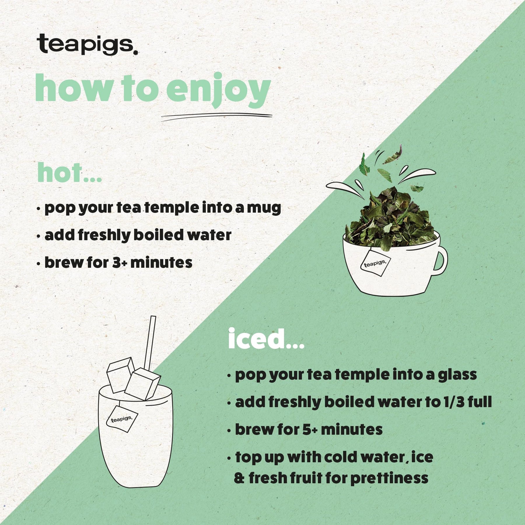 - Brewing instructions: Place one tea temple in your mug, pour over freshly boiled water (cooled for 1 minute), steep for 3–5 minutes, add milk if desired