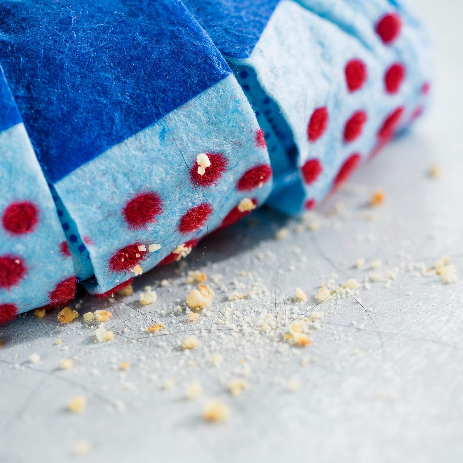 • Three cleaning zones: red non-scratch scourer for tough dirt, blue microfibre for greasy marks, and 3D red smart fibre dots for hair and particle pickup
