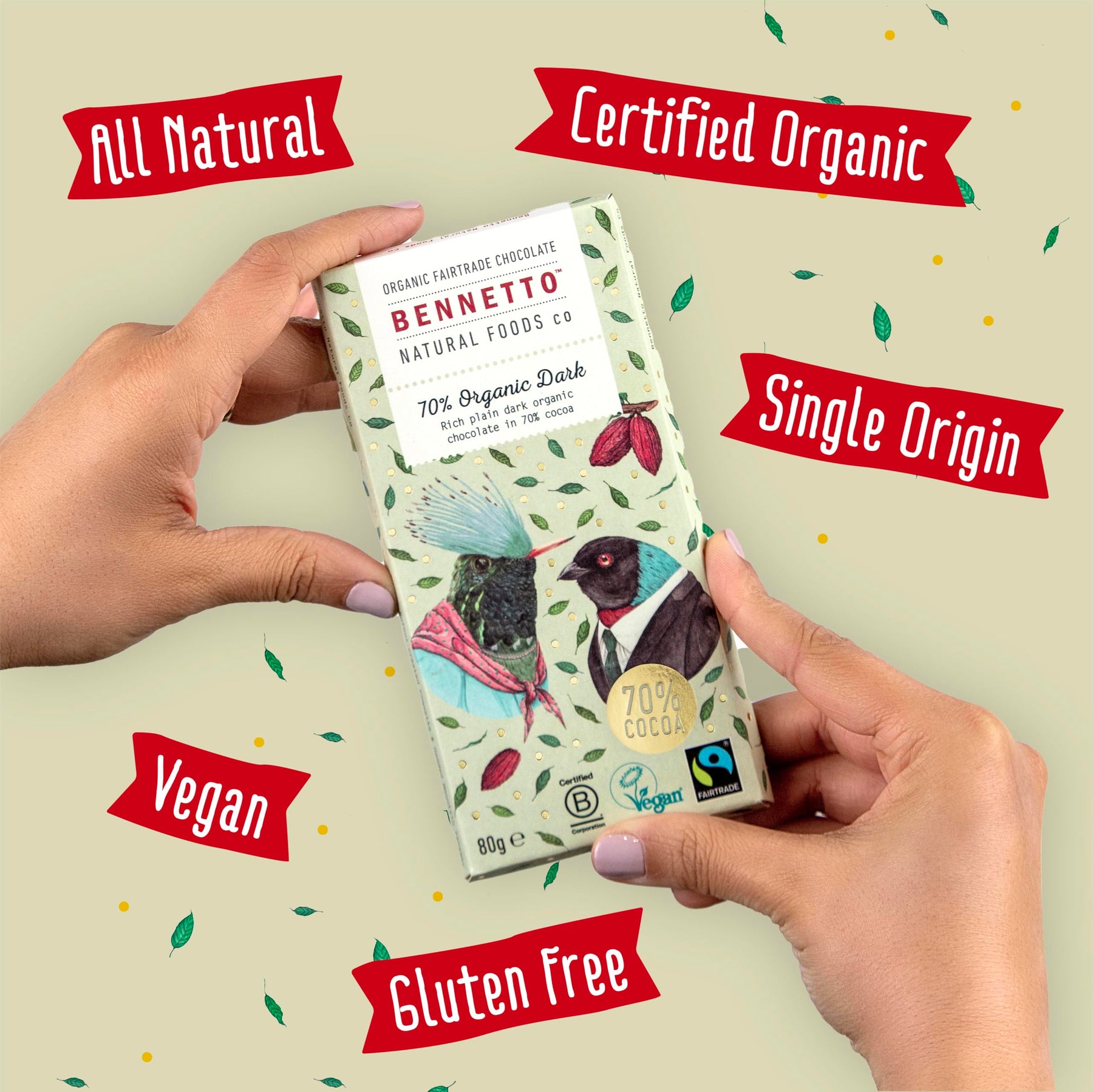 Bennetto's 70% Organic Dark Rich Chocolate is a premium, ethically crafted bar made from single-origin cocoa sourced in Ecuador. Every bite reflects a commitment to sustainability and quality, using only certified organic and Fairtrade ingredients. This vegan and gluten-free chocolate delivers a deep, satisfying flavor profile with notes of rich cocoa, perfect for conscious consumers who value taste and transparency.