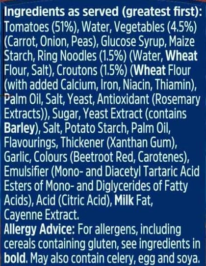 • Ingredients: Tomatoes (51%), Water, Vegetables (4.5%) (Carrot, Onion, Peas), Glucose Syrup, Maize Starch, Ring Noodles (1.5%) (Water, WHEAT Flour, Salt), Croutons (1.5%) (WHEAT Flour, Palm Oil, Salt, Yeast, Antioxidant), Sugar, Yeast Extract (contains BARLEY), Salt, Potato Starch, Palm Oil, Flavourings, Thickener, Garlic, Colours, Emulsifier, Acid, MILK Fat, Cayenne Extract