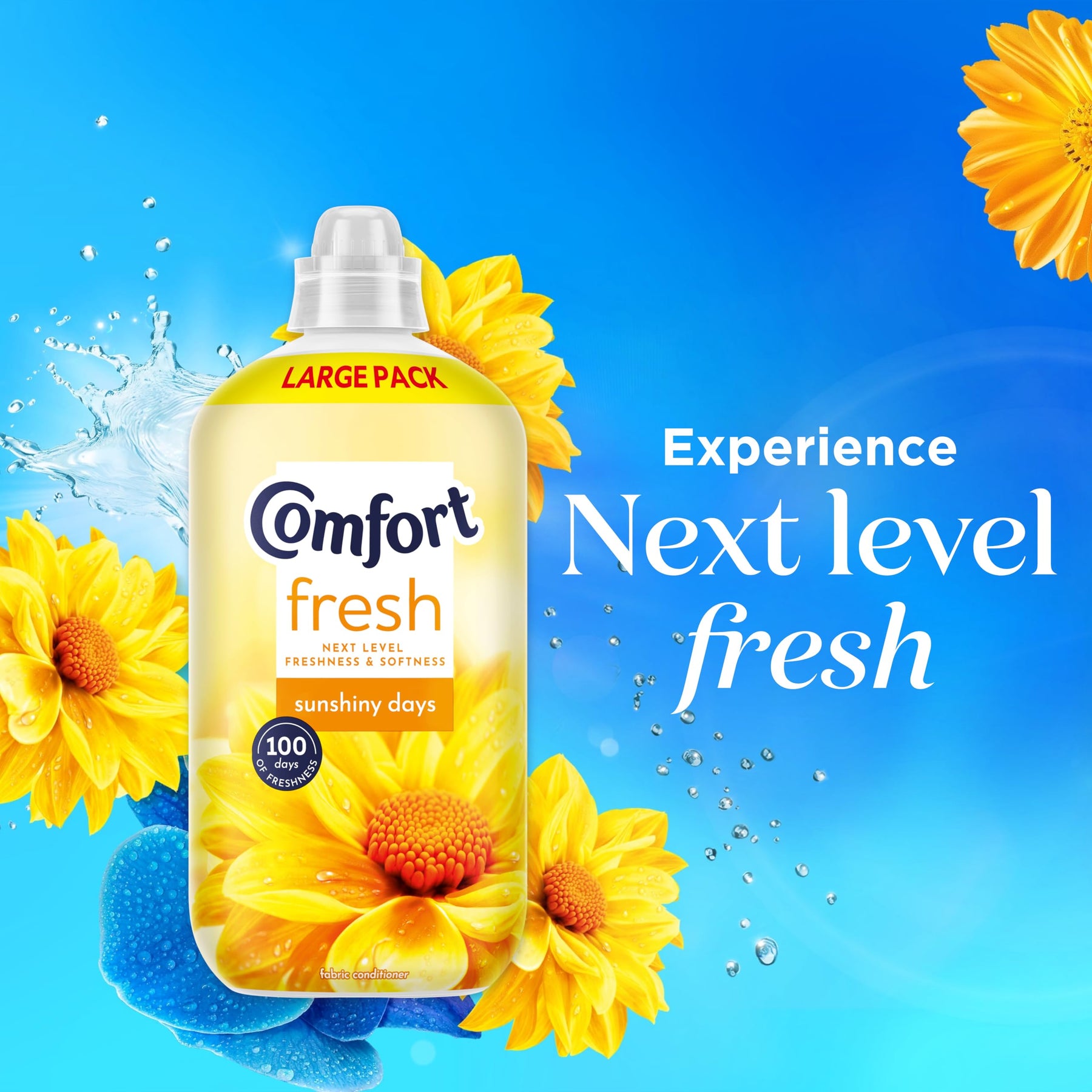 Transform your laundry routine with Comfort Fresh Sunshiny Days Fabric Conditioner, delivering multisensory freshness and softness with every wash. Experience long-lasting scent release through Comfort’s innovative motion-activated fragrance technology, designed to reawaken your senses with every movement of your clothes.