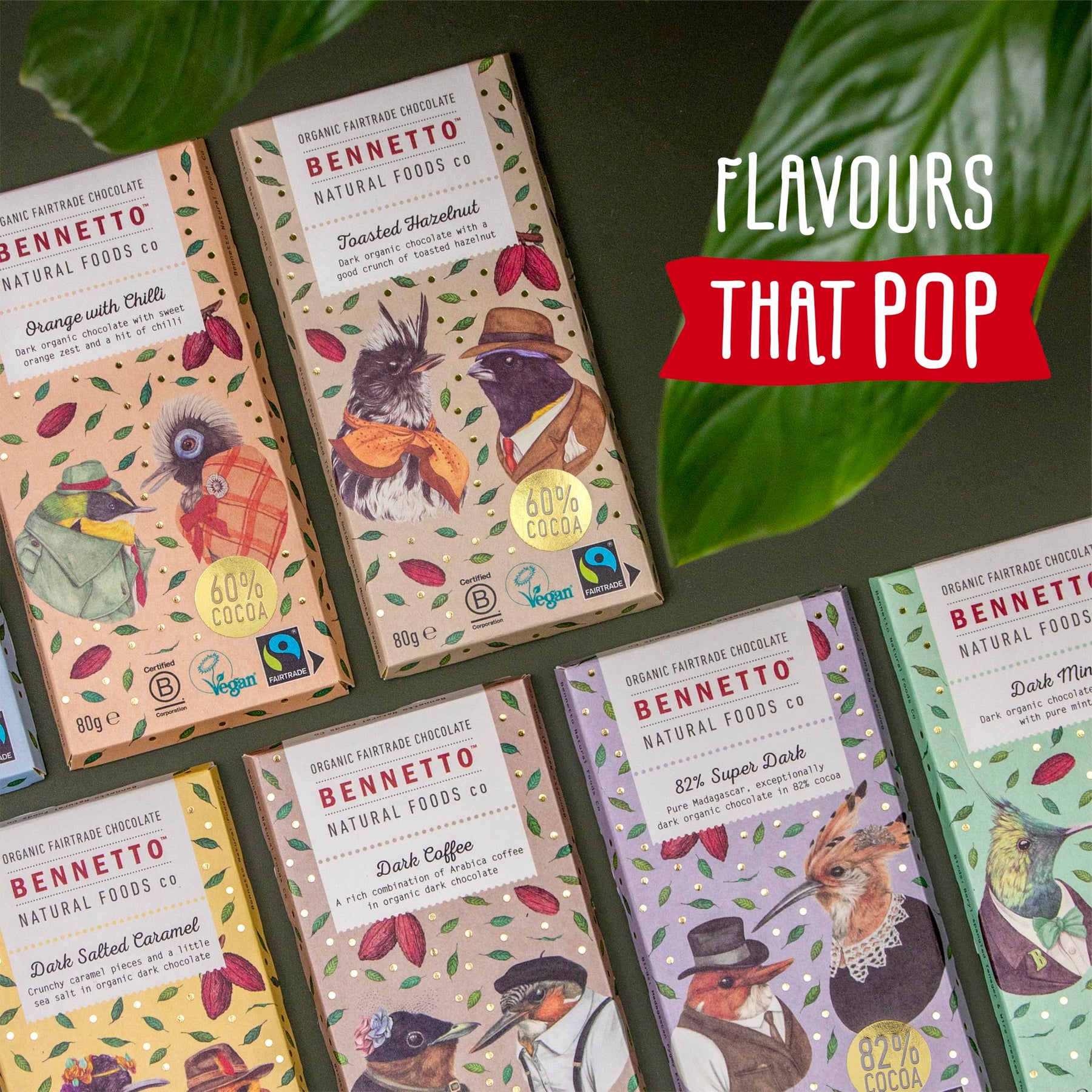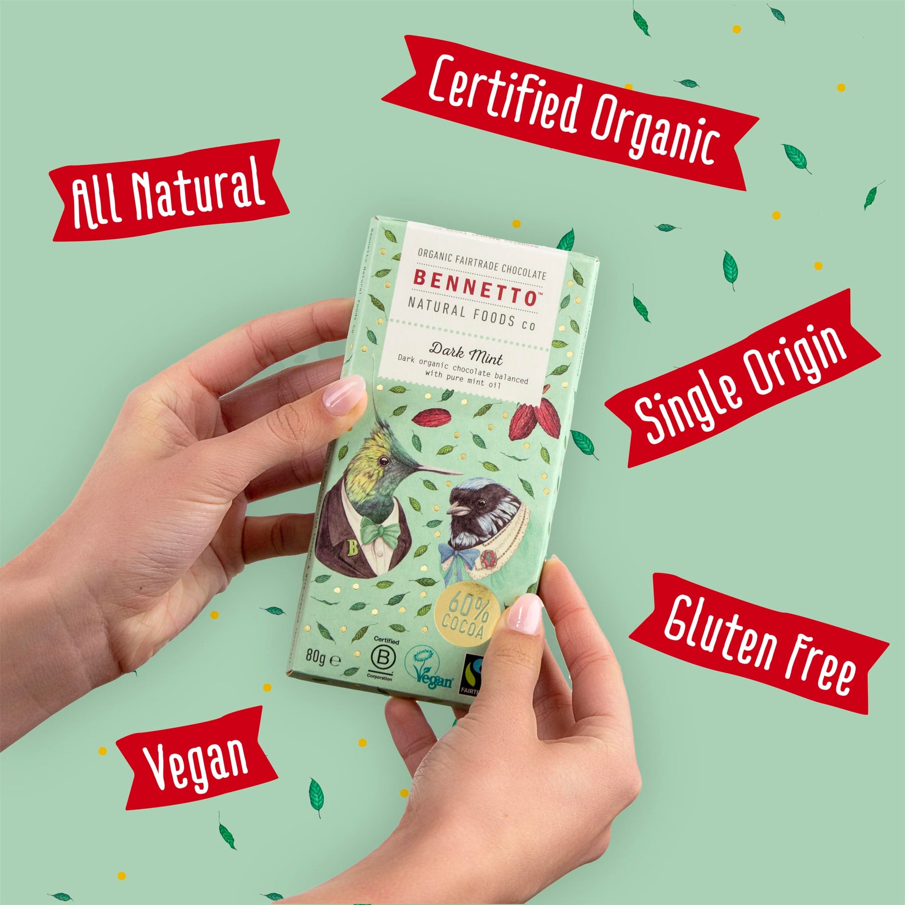 Bennetto Dark Mint chocolate offers a refreshing twist on classic dark chocolate, combining rich 60% cocoa solids with pure peppermint oil for a cool, invigorating taste. Crafted with single-origin Ecuadorian cocoa, this bar delivers a smooth, balanced flavor profile that's both indulgent and ethically made. Perfect for mint chocolate lovers seeking a vegan and gluten-free treat.