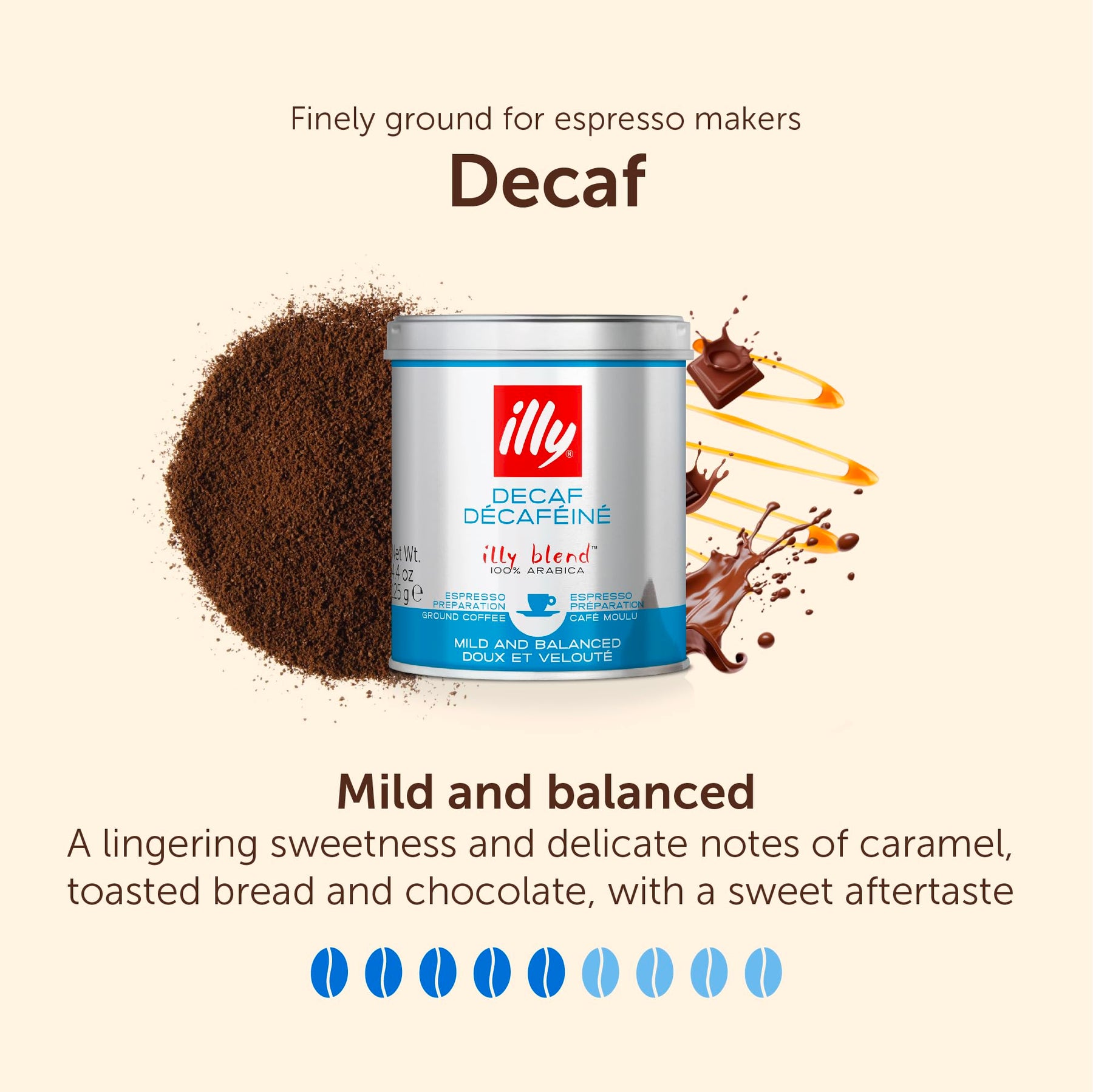 Experience the rich, smooth taste of illy's Decaf Ground Coffee, expertly crafted for espresso machines and other tamped coffee brewers. This medium roast decaffeinated blend offers a balanced profile with delicate notes of caramel, orange blossom, and jasmine, delivering a consistently flavorful cup with less than 0.1% caffeine.