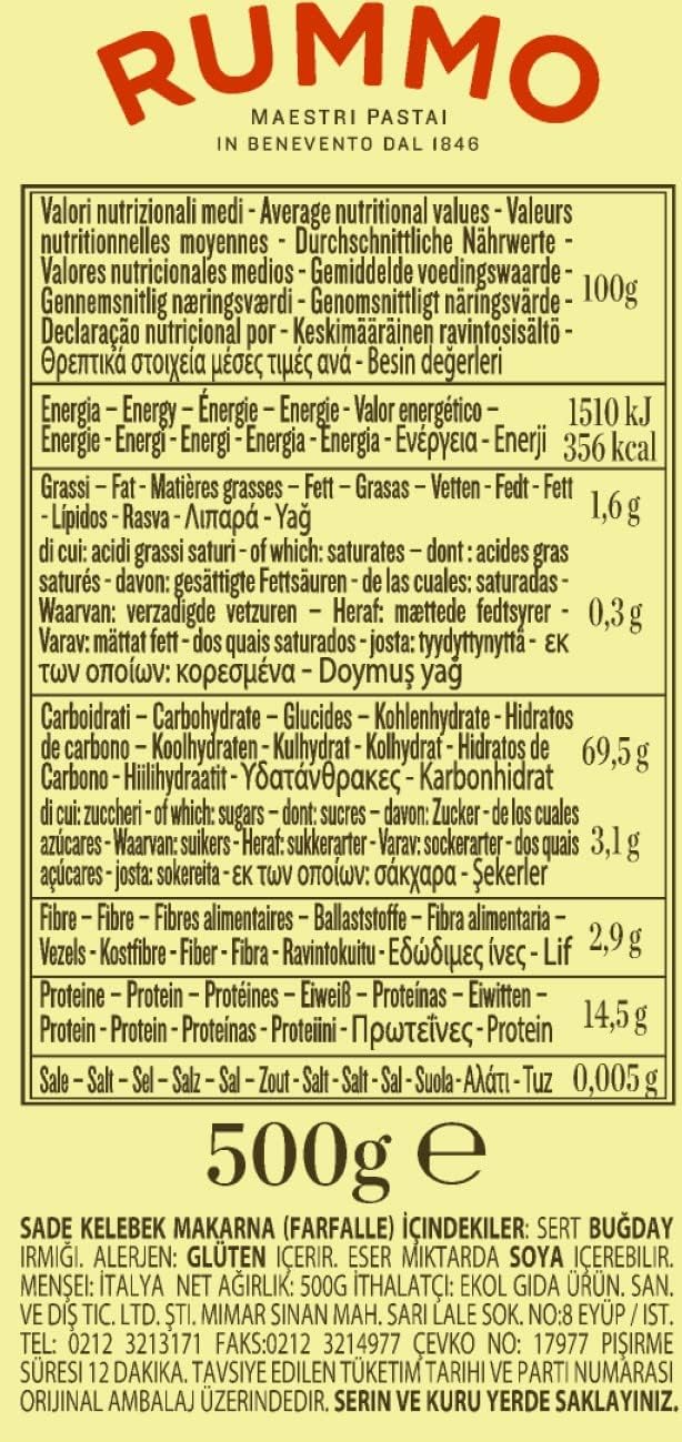 Delight in the elegant butterfly-shaped Farfalle pasta from Rummo, a luxurious Italian classic crafted for light and flavourful dishes. Made from premium organic durum wheat semolina, this artisanal pasta captures the essence of traditional Italian craftsmanship, perfect for enhancing salads, bakes, or quick weeknight meals with your favourite sauce.