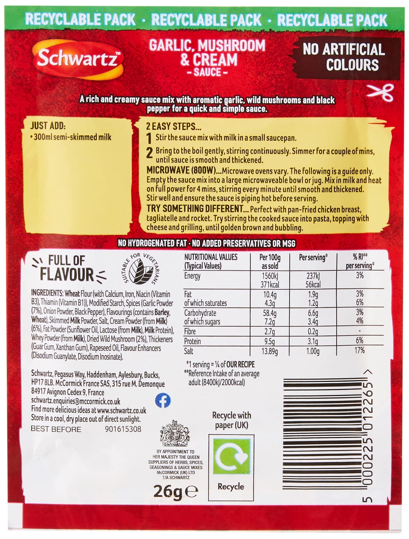 Create the perfect rich and creamy sauce with this expertly blended Schwartz Garlic, Mushroom & Cream Sauce Mix, featuring garlic and mushrooms for a delicious flavour everyone will love. Ideal for enhancing a wide range of dishes, this sauce mix delivers consistent, restaurant-quality results in minutes.