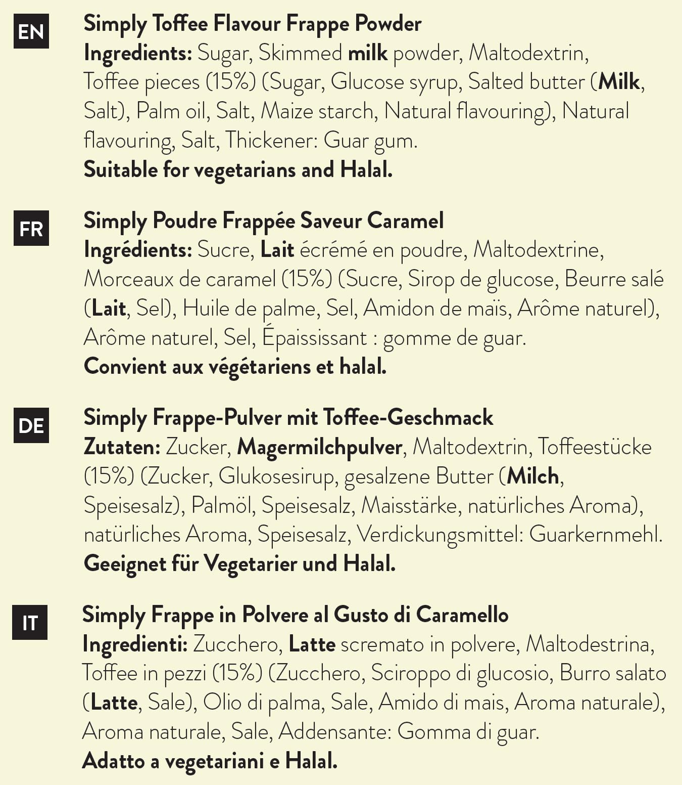 Indulge in the rich, sweet taste of caramel and real toffee pieces with Simply Toffee Frappe Powder. This easy-to-use mix creates smooth, creamy iced frappes at home in just 30 seconds—perfect for satisfying sweet cravings with café-quality results. Ideal for recreating nostalgic treats like sticky toffee pudding in drink form, it's a delicious way to enjoy dessert-inspired beverages anytime.