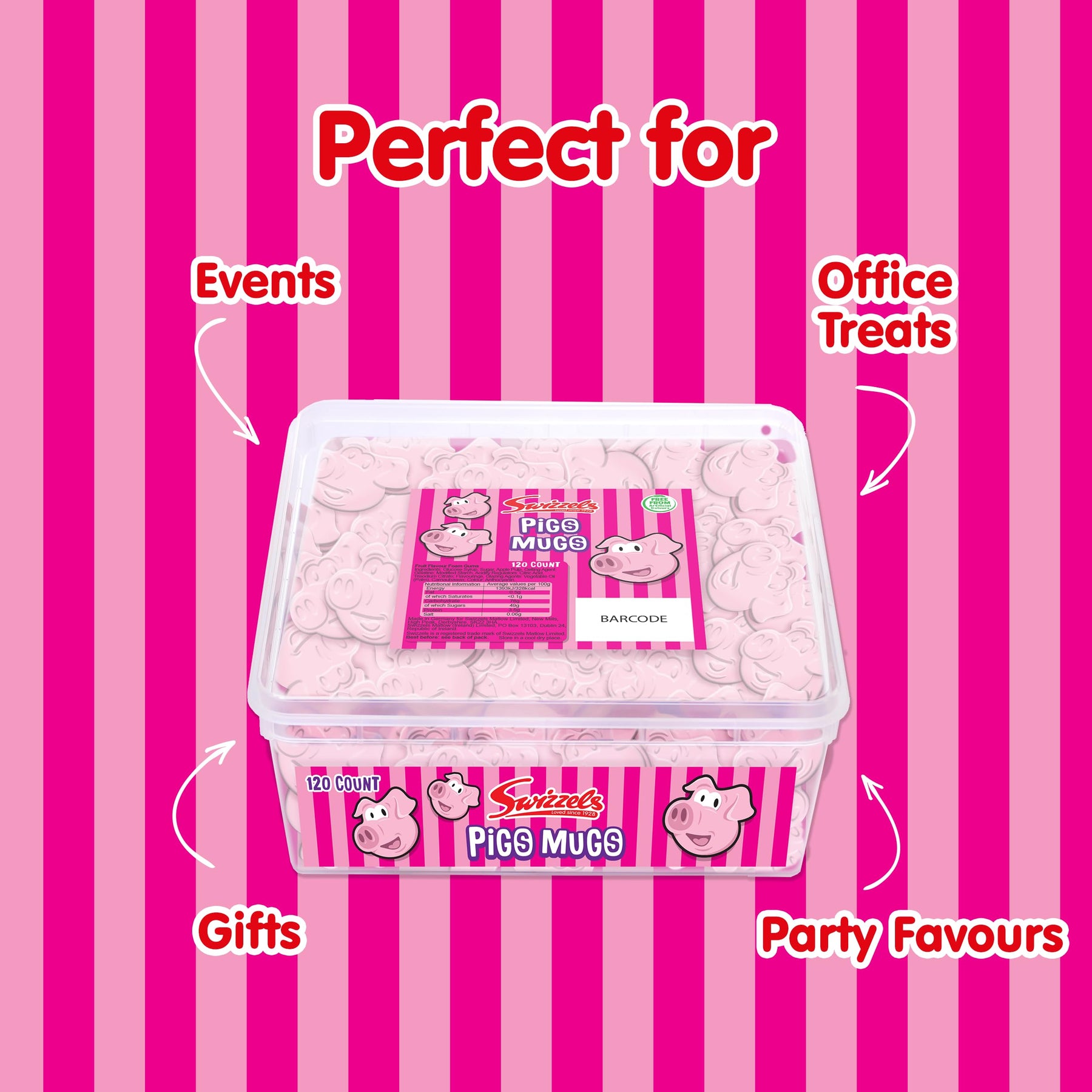 Dive into a delightful world of whimsy and flavour with Swizzels Fun Gums Pig's Mugs, a retro novelty sweet shaped like pig faces. Each large tub contains approximately 120 fruit-flavoured foam gums, offering a soft, chewy texture that delivers a burst of fruity taste with every bite. Crafted by Swizzels, a brand with a confectionery heritage dating back to 1928, these playful sweets are free from artificial colours and perfect for sharing at parties, celebrations, or as a fun snack.