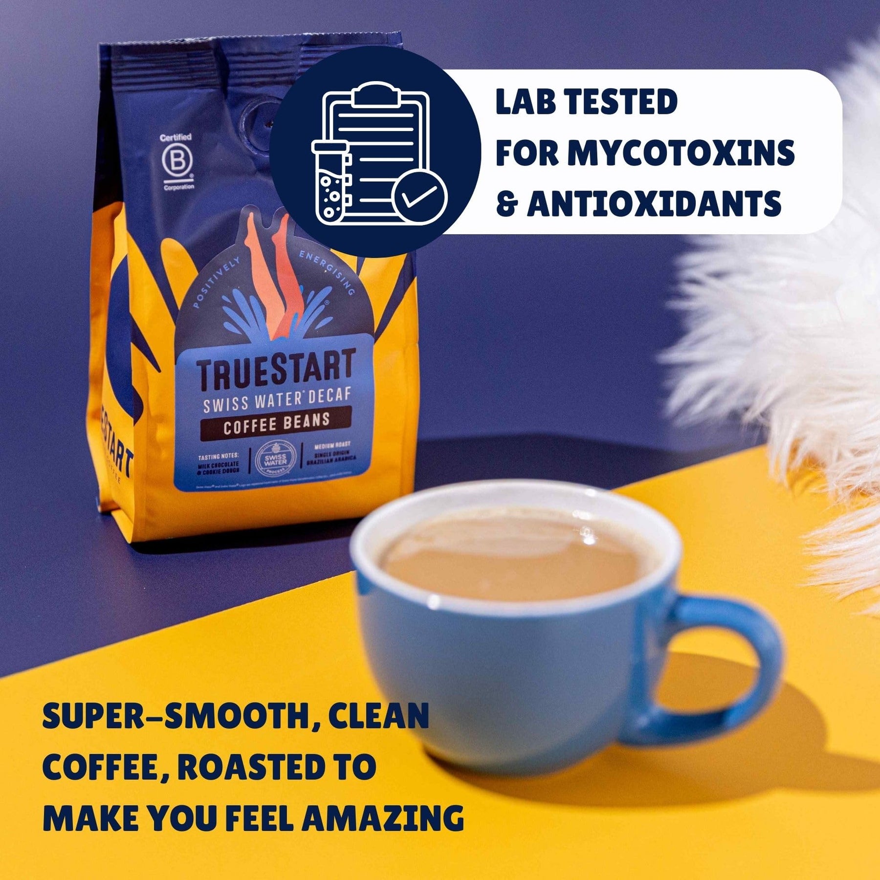 Experience the rich, nuanced flavor of TrueStart's Swiss Water Decaf Ground Coffee, crafted for discerning coffee lovers who value ethical sourcing and exceptional taste. Sourced from smallholder farms, this single origin, 100% Arabica coffee delivers a distinct character in every cup. Scoring 85+ on the SCAA scale, it's specialty grade—ensuring vibrant aroma and balanced depth with every brew.