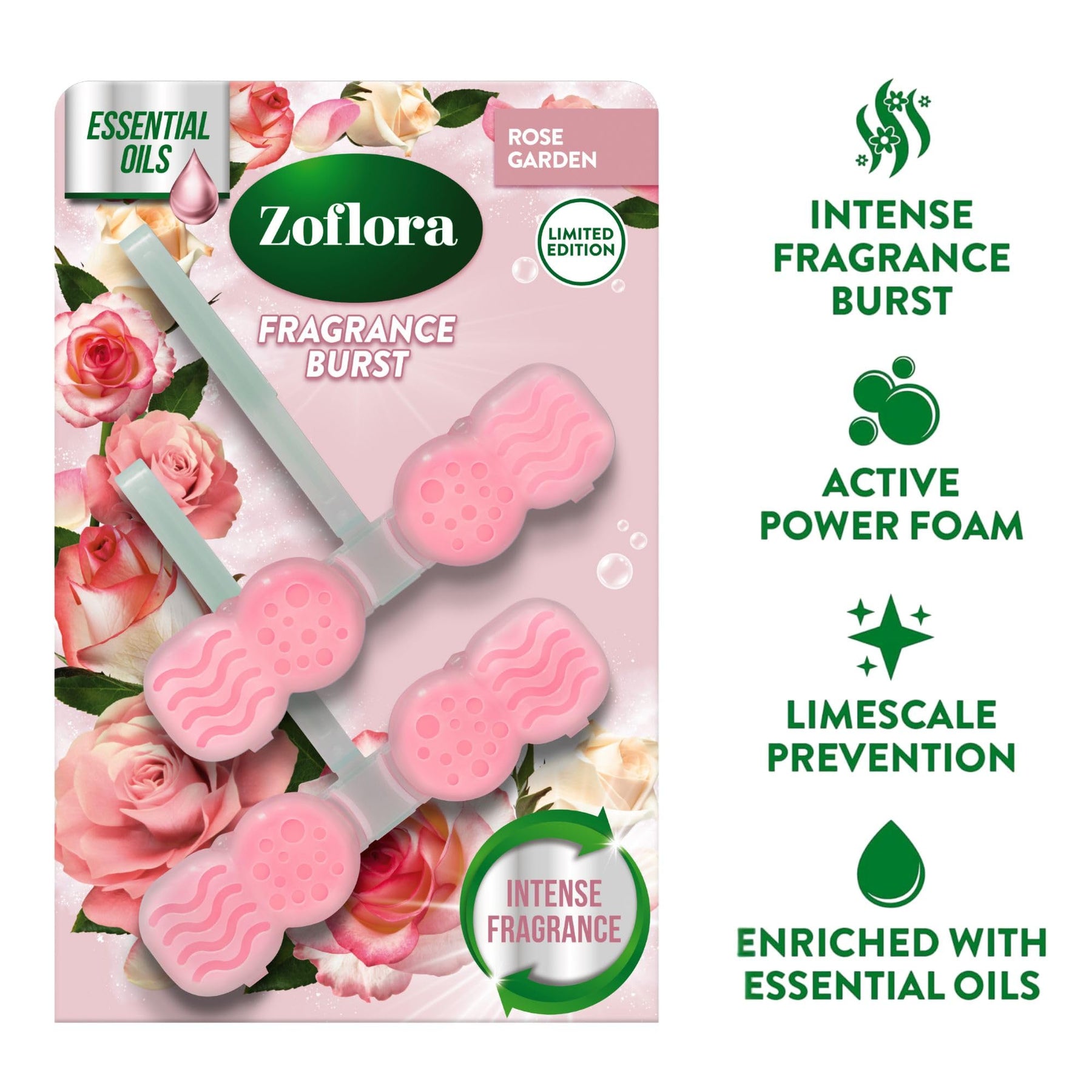 Transform your bathroom into a clean, fragrant sanctuary with Zoflora’s Rose Garden Fragrance Burst Rim Blocks—experience freshness that lasts.