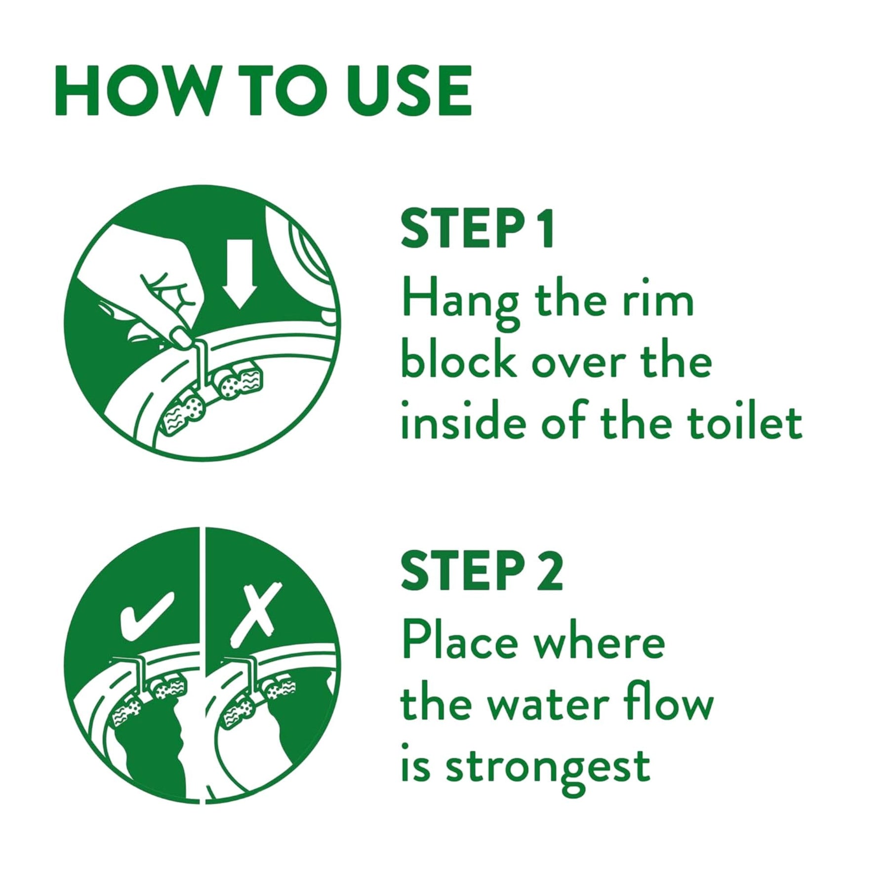 - Directions: Break the plastic lock, hang the block inside the toilet rim, position in strongest water flow, remove when empty